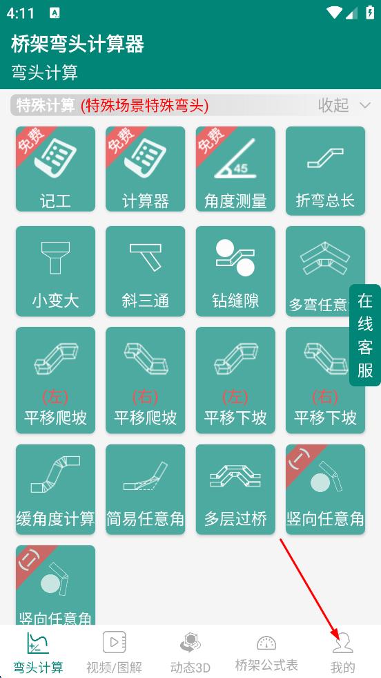1、打開橋架彎頭計算器軟件,進(jìn)入彎頭計算頁面,點(diǎn)擊頁面下方的“我的”選項,進(jìn)入個人中心頁面。