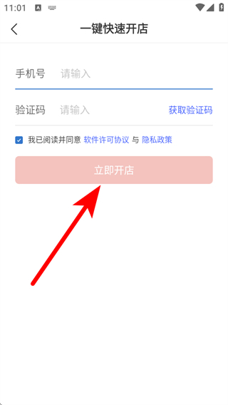 2、進入開店頁面后,輸入手機號和驗證碼后,點擊立即開店。