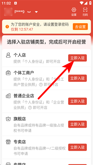3、在店鋪類型選擇頁面,選擇要入駐的店鋪類型,點擊立即入駐。