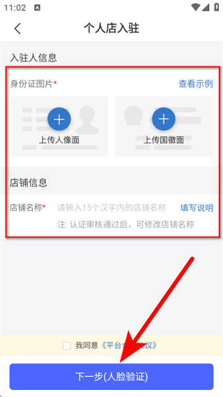 4、進入信息填寫頁面,上傳身份證和填寫店鋪名稱,點擊下一步完成后續(xù)流程。