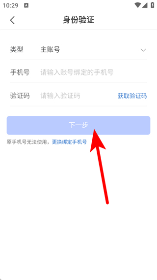 3、進入身份驗證頁面,選擇賬號類型,輸入手機號和驗證碼,點擊下一步。