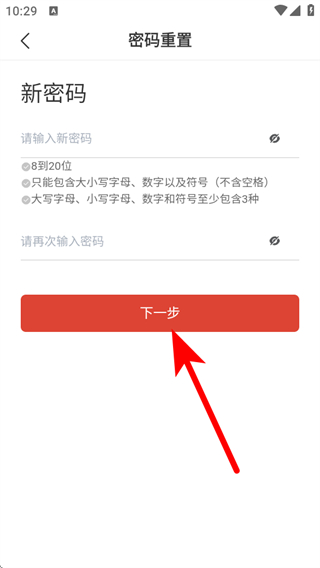 4、進入密碼重置頁面,設置密碼后點擊下一步,完成賬號密碼的找回操作。