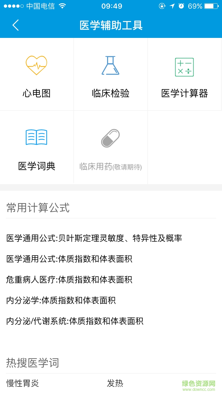 目前已上線醫(yī)學計算器、醫(yī)學詞典、心電圖、臨床檢驗四種醫(yī)學小工具,在線計算、中英文名詞查詢,是臨床醫(yī)生日常工作的好幫手。