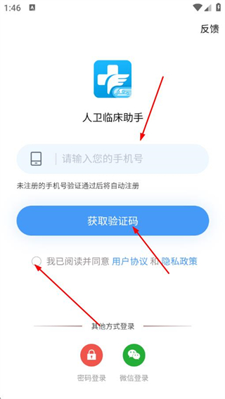 1、打開人衛(wèi)臨床助手APP,在登錄頁面輸入手機號,勾選我協(xié)議,點擊獲取驗證碼。