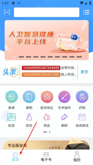 3、登錄后即可進入APP首頁,使用疾病、病例、癥狀體征、手術操作、藥物等相關功能。