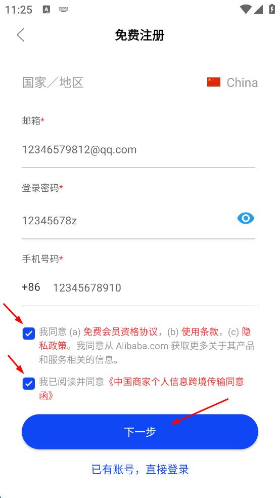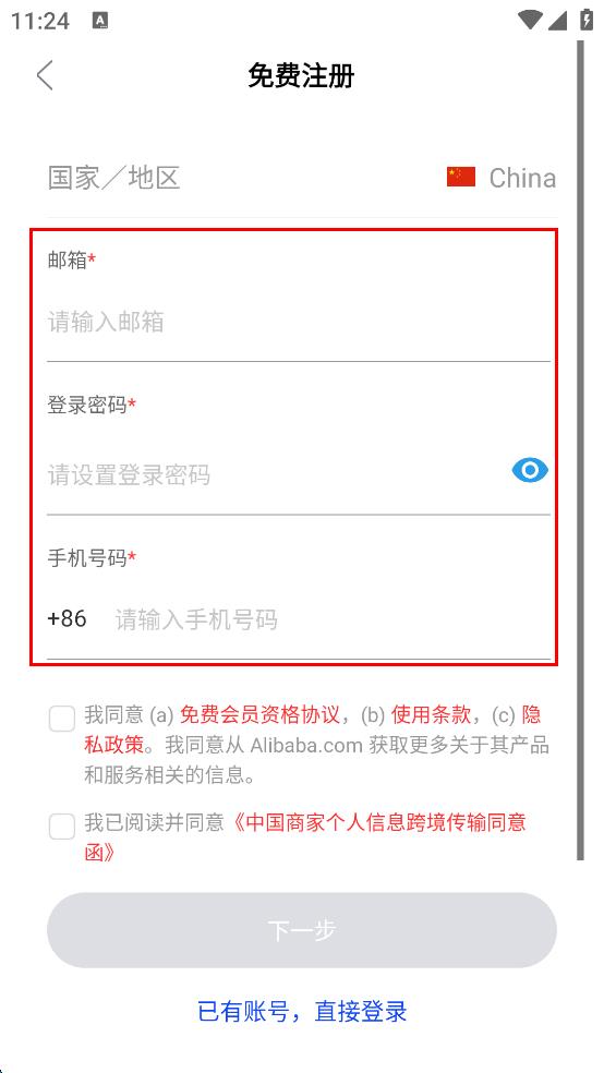 4、填寫好信息后,勾選協(xié)議、使用條款、隱私政和同意中國商家個人信息跨境傳輸同意函,然后點(diǎn)擊“下一步”按鈕,繼續(xù)后續(xù)注冊流程。