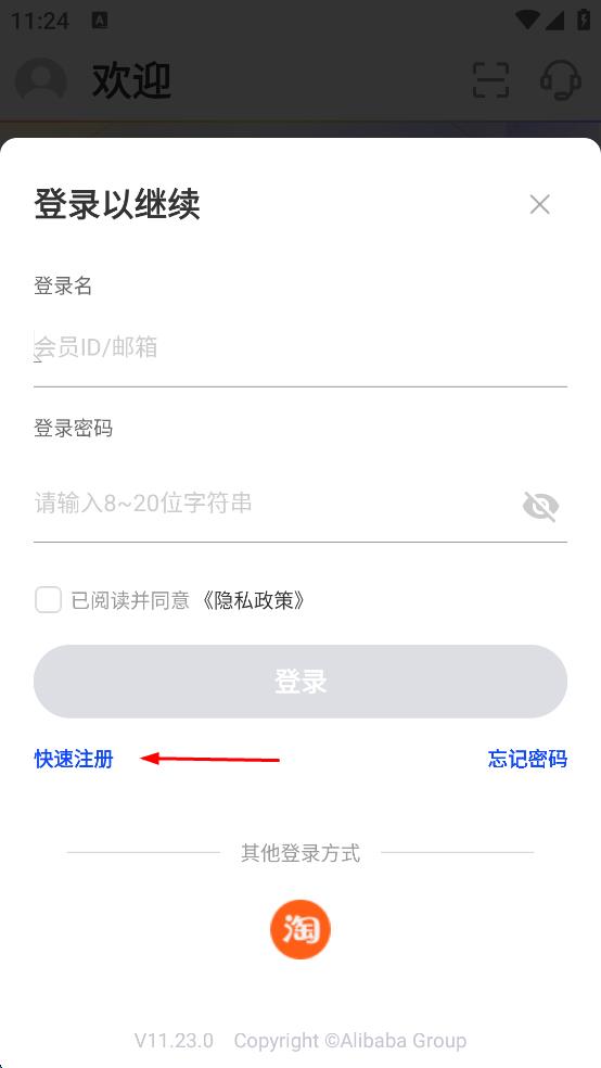 2、進(jìn)入登錄頁面后,若沒有賬號,點(diǎn)擊“快速注冊”選項(xiàng),進(jìn)入免費(fèi)注冊界面。