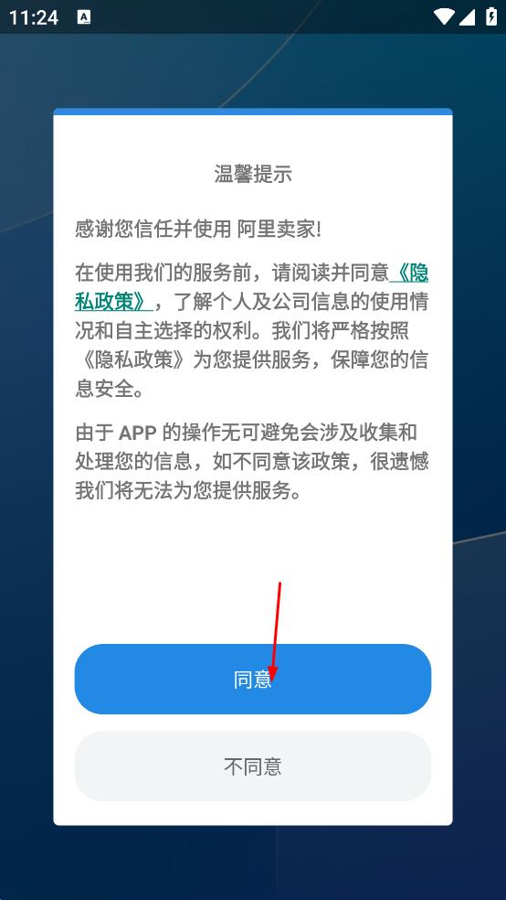 1、打開阿里賣家,會彈出溫馨提示頁面,提示閱讀并同意隱私政策,若同意,點(diǎn)擊“同意”按鈕,若不同意則無法使用服務(wù)。