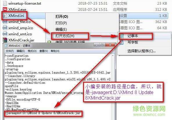 3.找到安裝目錄下的“XMind.ini”文件,右鍵-打開(kāi)方式-記事本,在最后一行加上“-javaagent:XMindCrack.jar路徑位置”(如下圖)