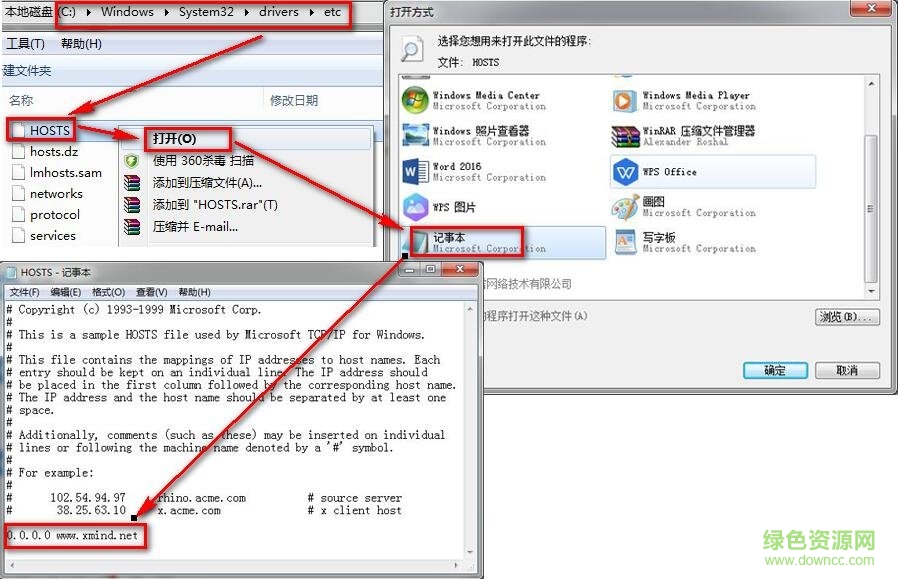 4.找到C:\Windows\System32\drivers\etc文件夾下的hosts文件,用記事本的方式打開(kāi),在末尾加上0.0.0.0 www.xmind.net(阻止xmind聯(lián)網(wǎng)),然后保存(這一步很重要)