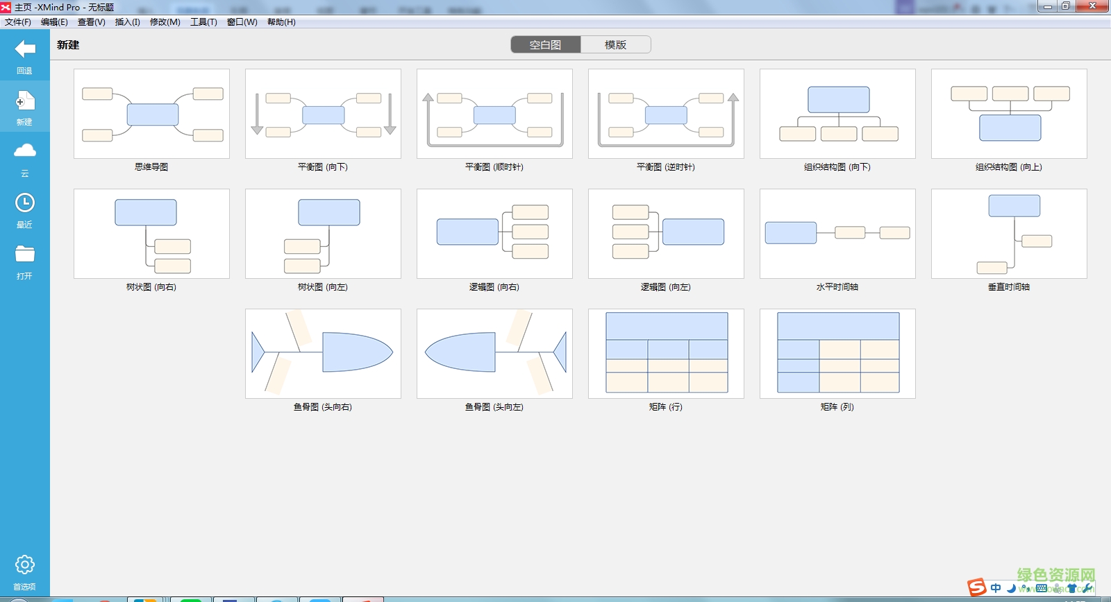 1、進(jìn)入XMind后,首先看到的是新建模板界面,這里可以挑選從某個(gè)模版開(kāi)始,或者某種風(fēng)格的空白圖開(kāi)始。個(gè)人建議,新手的小伙伴最好先從使用空白的模版開(kāi)始,這樣不至于忽略思維導(dǎo)圖本身的作用。
