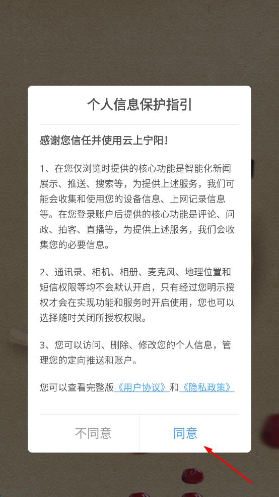 1、打開云上寧陽APP,在彈出的個人信息保護指引提示框中,點擊同意。