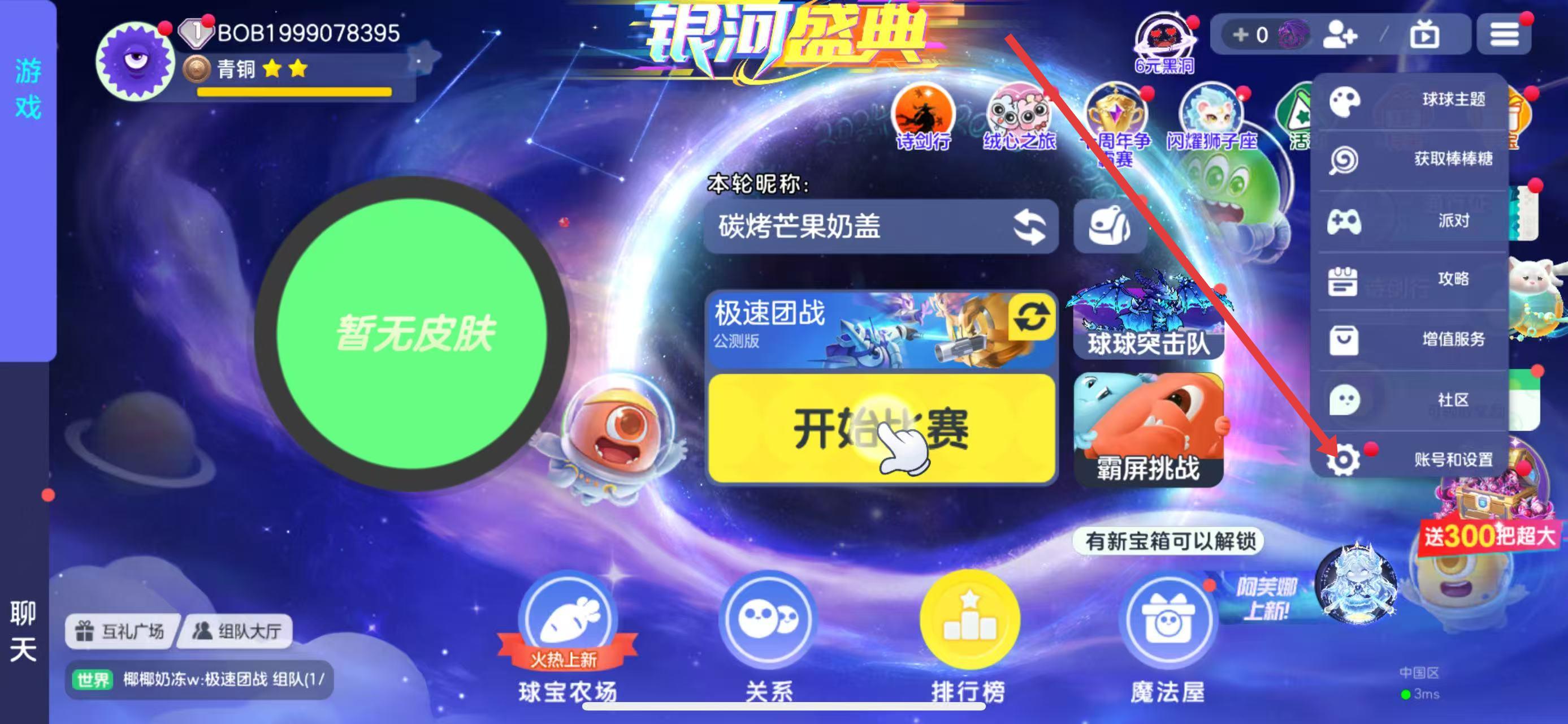 1、進(jìn)入游戲主界面,點(diǎn)擊右側(cè)菜單欄中賬號(hào)和設(shè)置,可在此處對(duì)游戲賬號(hào)、基礎(chǔ)設(shè)置等進(jìn)行管理與調(diào)整,開啟游戲設(shè)置探索。