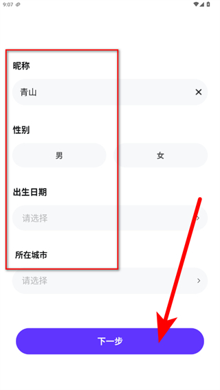 4.設(shè)置昵稱、選擇性別、出生日期和所在城市,點擊下一步即可完成賬號注冊。