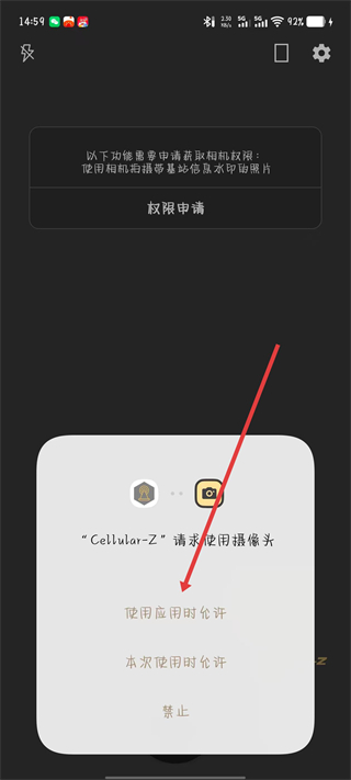 4、在相機權(quán)限申請窗口中選擇使用應(yīng)用時允許,即可開啟水印相機。
