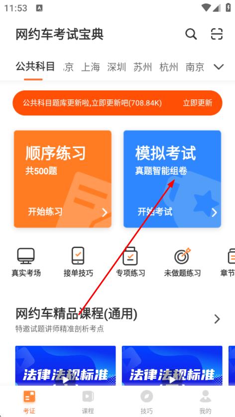 1、打開網(wǎng)約車考試寶典APP,進(jìn)入主界面,點(diǎn)擊模擬考試下方的開始考試選項(xiàng)。