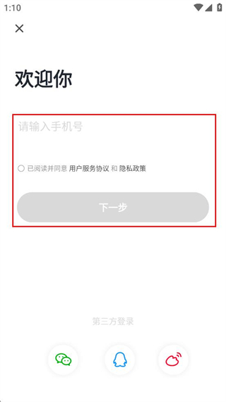 2、進(jìn)入注冊登錄頁面,在輸入框內(nèi)填寫常用手機(jī)號碼,勾選已閱讀并同意用戶服務(wù)協(xié)議和隱私政策,準(zhǔn)備點(diǎn)擊下一步。