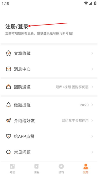 1、打開網(wǎng)約車考試寶典進(jìn)入主界面,點(diǎn)擊底部導(dǎo)航欄的我的選項(xiàng),進(jìn)入個(gè)人頁面后找到注冊登錄入口并點(diǎn)擊。