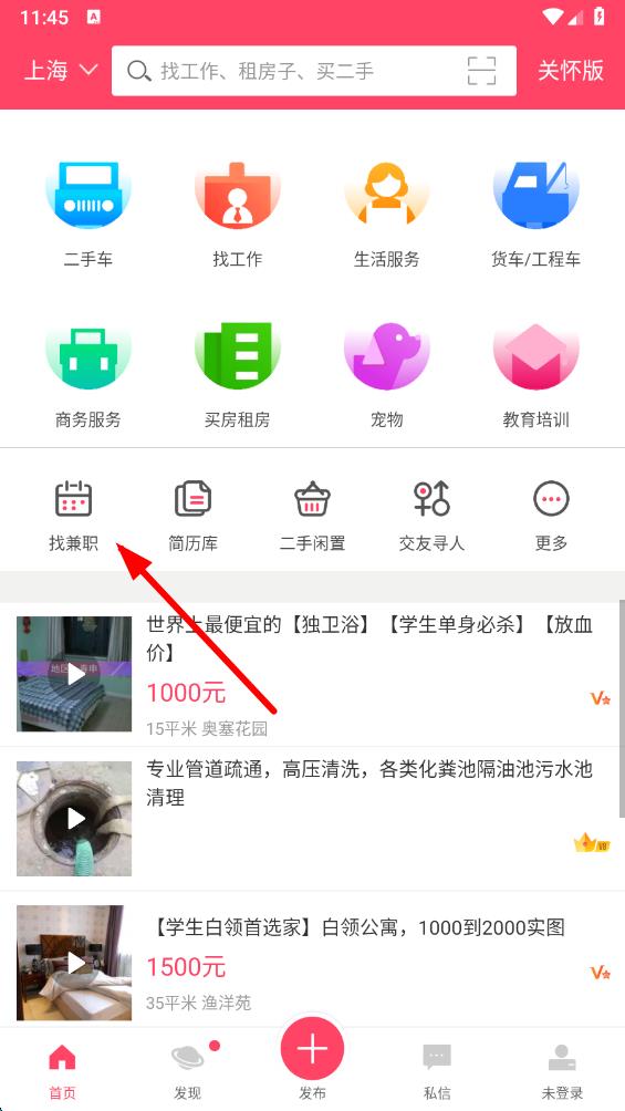 1、打開(kāi)百姓網(wǎng)app,在首頁(yè)中找到并點(diǎn)擊找兼職選項(xiàng),進(jìn)入兼職信息頁(yè)面。