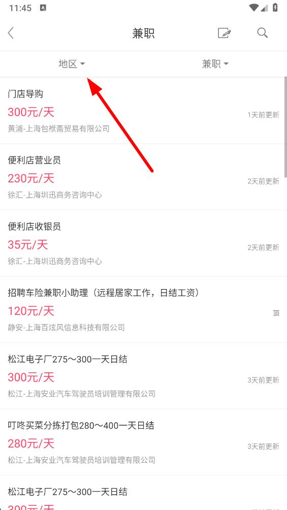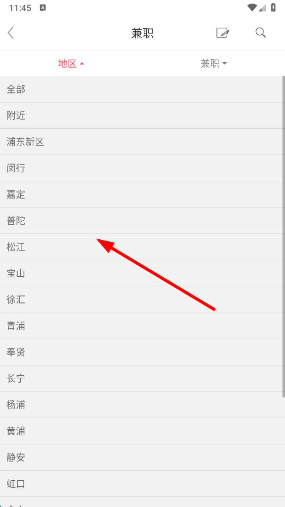 2、在兼職信息頁(yè)面,點(diǎn)擊地區(qū)選項(xiàng),篩選想要找兼職的地區(qū)范圍。