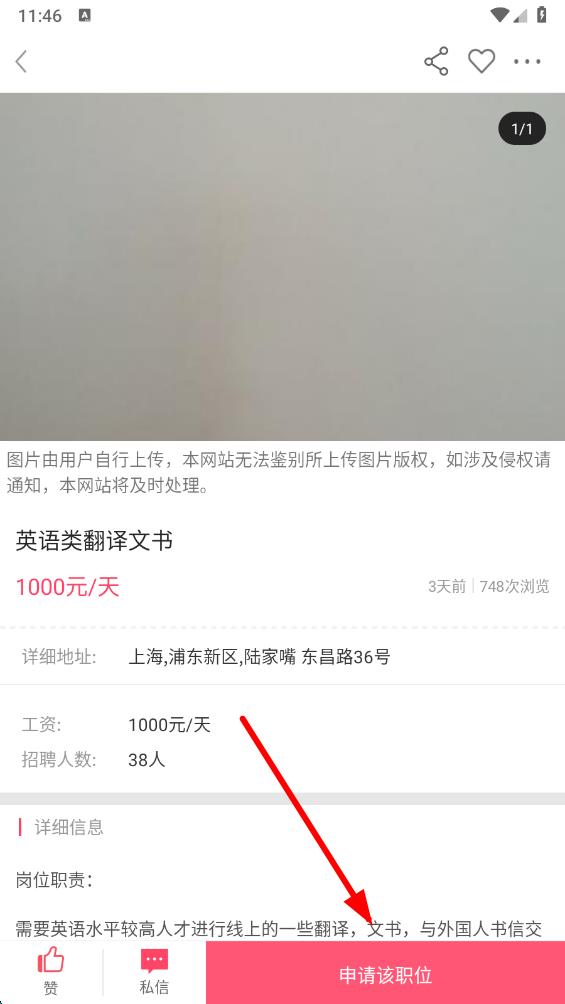 5、在詳情頁(yè)中查看崗位的詳細(xì)地址、工資、招聘人數(shù)等信息,確認(rèn)合適后,點(diǎn)擊申請(qǐng)?jiān)撀毼?,按照提示完成申?qǐng)操作。