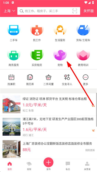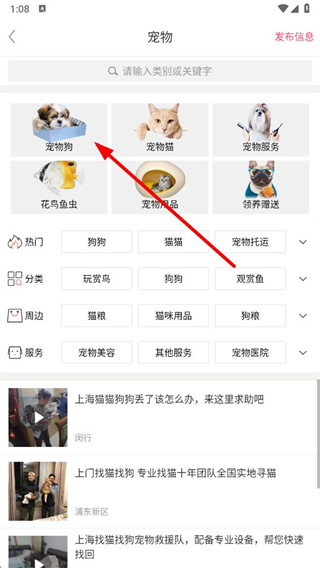 1、打開(kāi)百姓網(wǎng)app,點(diǎn)擊寵物選項(xiàng),進(jìn)入寵物分類頁(yè)面。