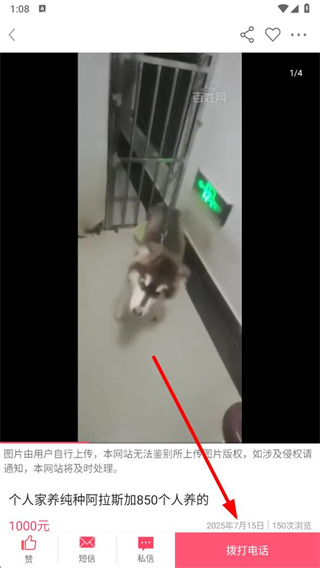 4、在寵物狗詳情頁(yè)面點(diǎn)擊撥打電話按鈕,聯(lián)系賣家溝通購(gòu)買事宜。