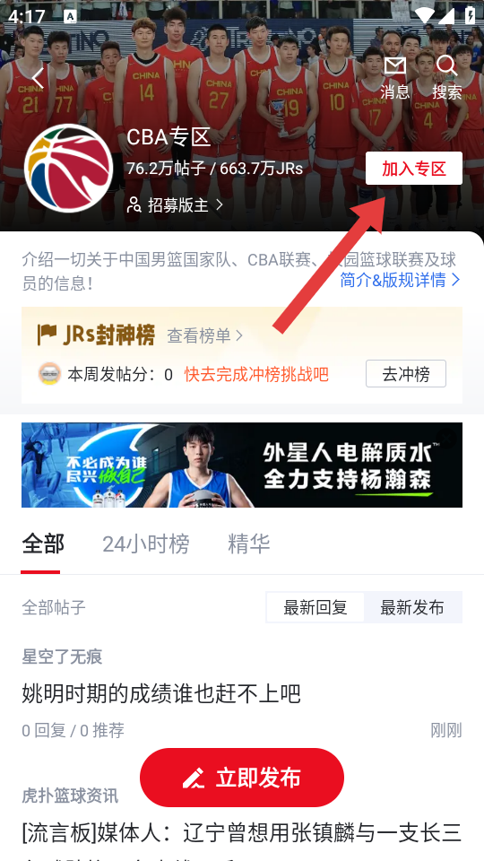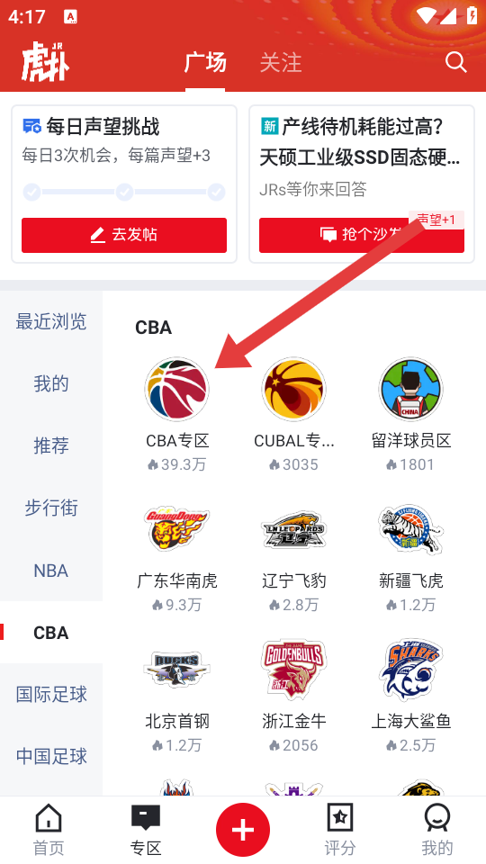 2、在專區(qū)頁面中,找到想要關注的話題所屬專區(qū)如示例中的CBA專區(qū),點擊進入該專區(qū)。