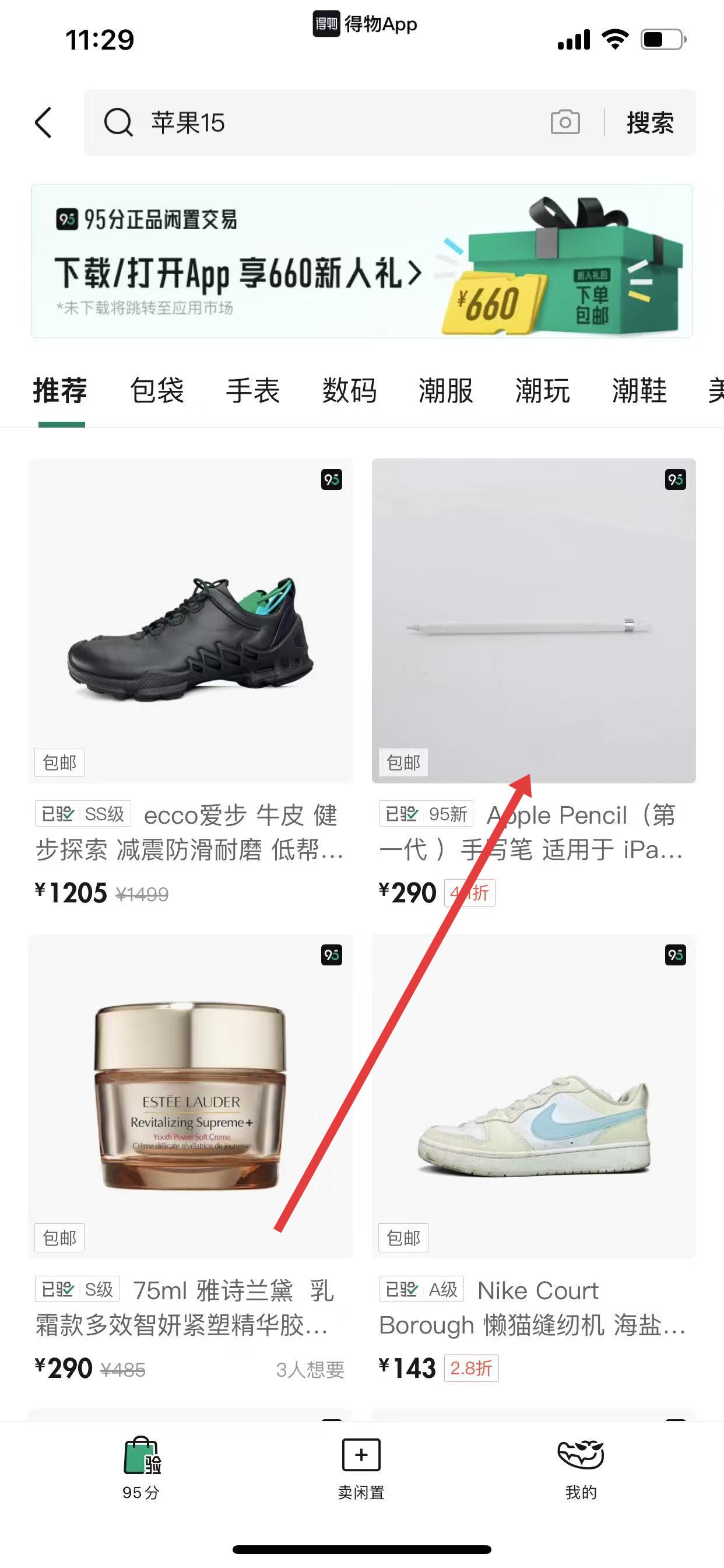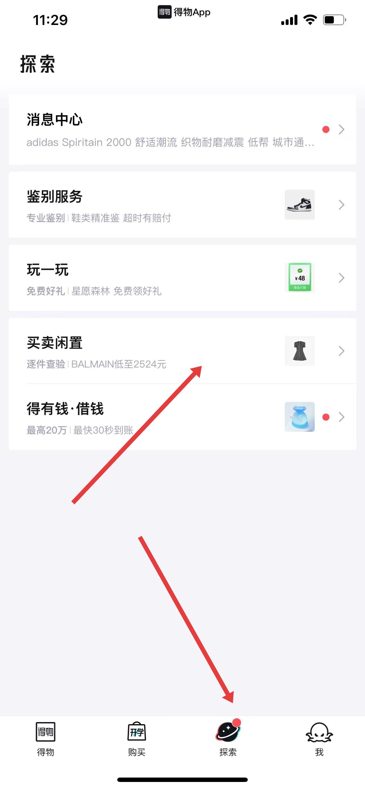 1、打開(kāi)得物APP,點(diǎn)擊底部探索,進(jìn)入探索頁(yè)面后選擇買賣閑置。