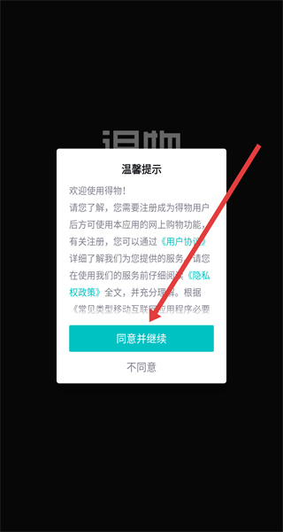 1、點(diǎn)擊“溫馨提示”彈窗的“同意并繼續(xù)”,進(jìn)入得物APP主界面。