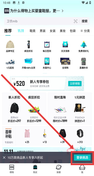 1、在得物APP首頁(yè)點(diǎn)擊右下角“我”,進(jìn)入登錄頁(yè)面。