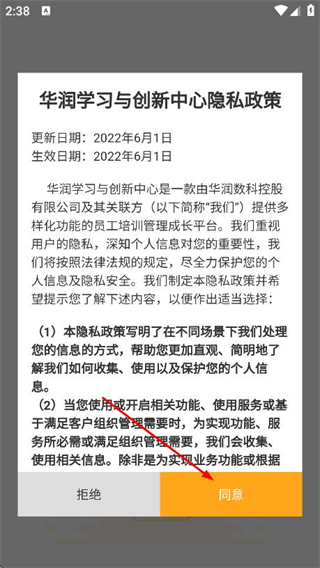 1、打開華潤大學app,在彈出的提示框中點擊同意。