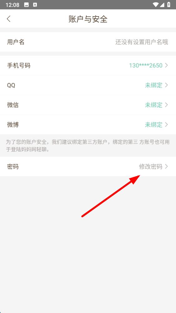 4、在賬戶與安全界面中,點(diǎn)擊修改密碼選項(xiàng),進(jìn)入修改密碼頁(yè)面。