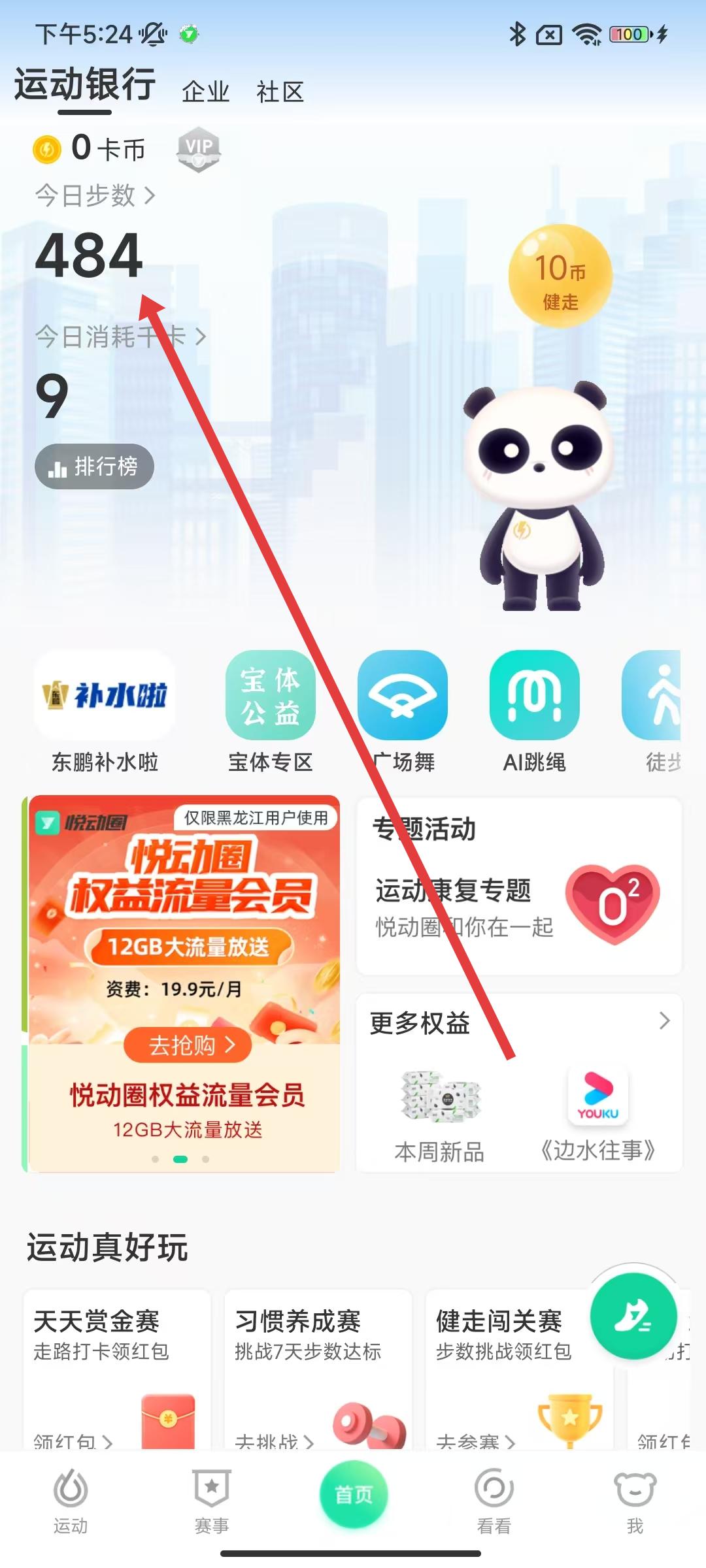 1、打開(kāi)悅動(dòng)圈APP,在首頁(yè)點(diǎn)擊上方「今日步數(shù)」區(qū)域,進(jìn)入運(yùn)動(dòng)選擇界面。
