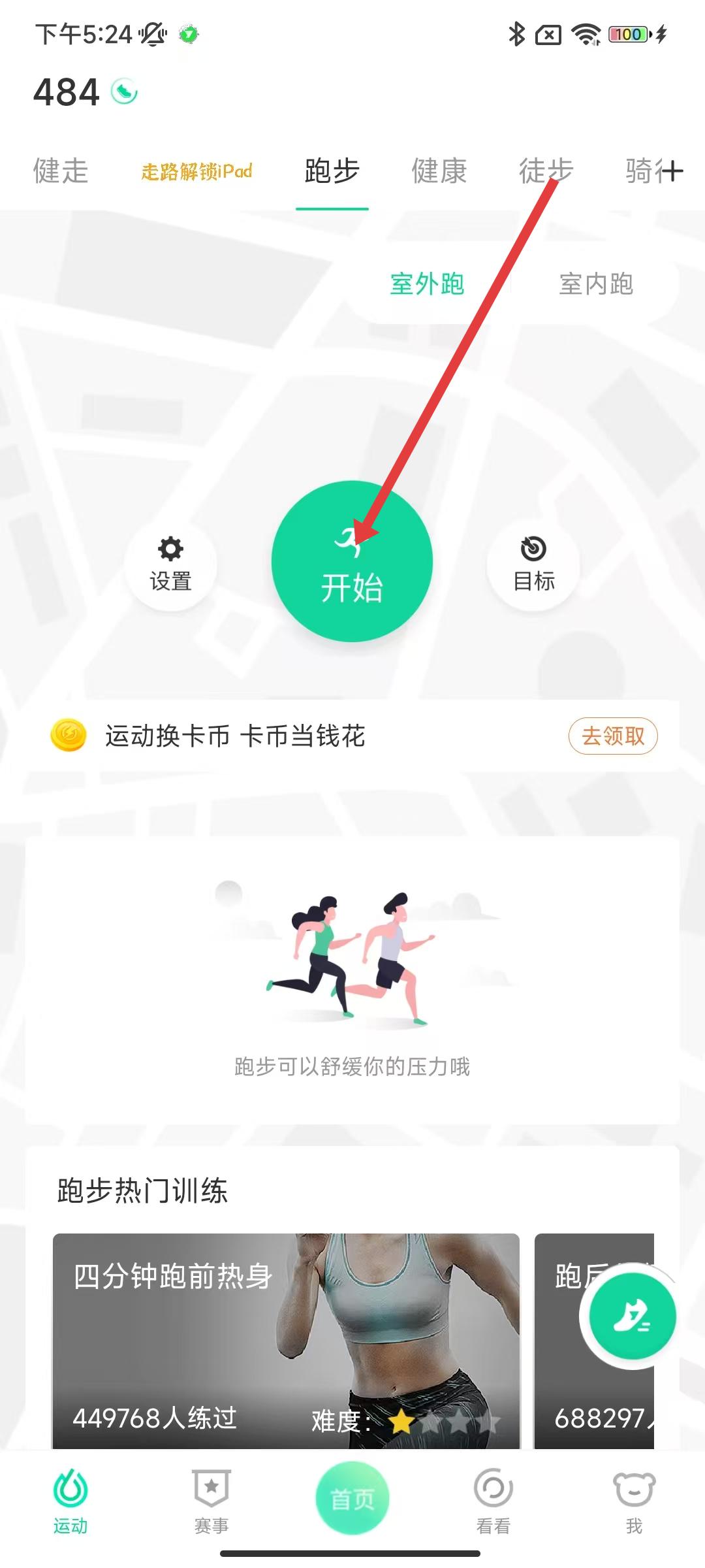 2、滑動(dòng)切換運(yùn)動(dòng)模式,如跑步切換室外跑,點(diǎn)擊中間綠色「開(kāi)始」按鈕,啟動(dòng)運(yùn)動(dòng)監(jiān)測(cè)。