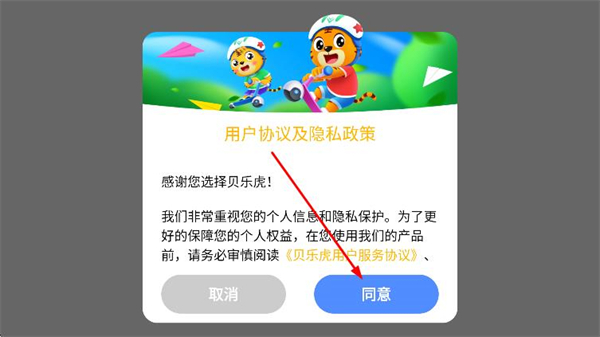 1、打開貝樂虎數學app,在彈出的隱私政策頁面,點擊同意。