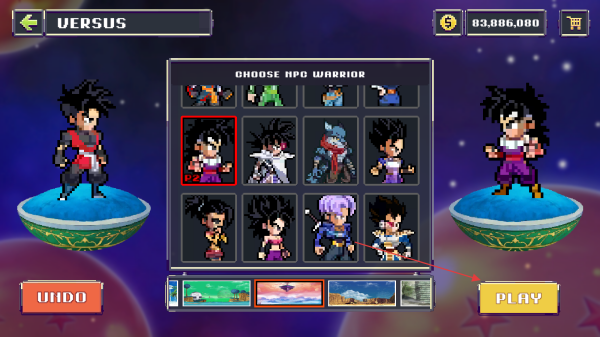 1、進(jìn)入游戲選角界面,瀏覽可選英雄角色,根據(jù)角色外觀技能偏好,點(diǎn)擊選定,確認(rèn)后按下PLAY按鈕,進(jìn)入戰(zhàn)斗場景,準(zhǔn)備格斗對戰(zhàn)。