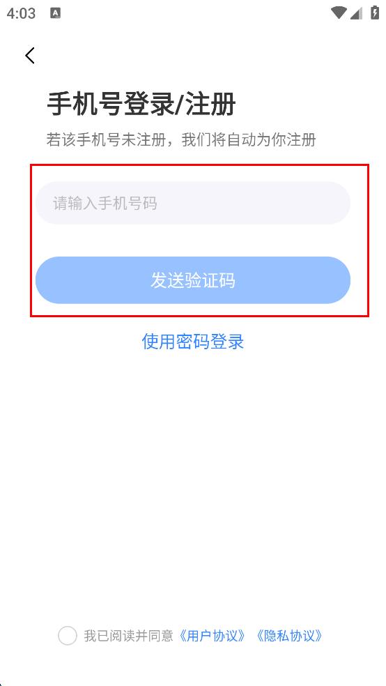 4、在手機(jī)號(hào)登錄/注冊(cè)頁(yè)面,先在“請(qǐng)輸入手機(jī)號(hào)碼”輸入框中輸入手機(jī)號(hào)碼,然后點(diǎn)擊“發(fā)送驗(yàn)證碼”按鈕,待收到驗(yàn)證碼后輸入,完成登錄或注冊(cè)操作。