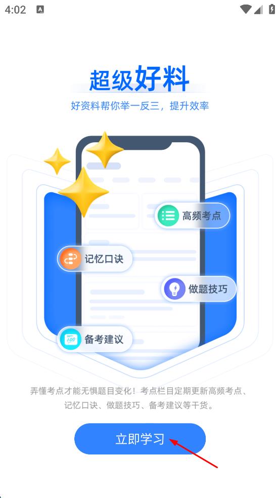 1、打開考醫(yī)獅軟件,看到“超級(jí)好料”相關(guān)展示,點(diǎn)擊“立即學(xué)習(xí)”按鈕,進(jìn)入軟件主界面。