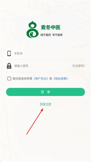 1、打開麥冬中醫(yī)app,在登錄界面點擊快速注冊按鈕。