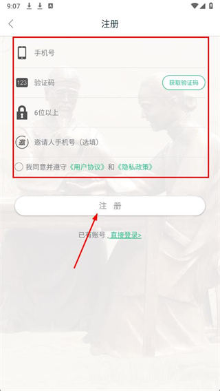 2、輸入手機(jī)號(hào)、驗(yàn)證碼,設(shè)置密碼,填寫(xiě)邀請(qǐng)人手機(jī)號(hào),勾選用戶(hù)協(xié)議和隱私政策,點(diǎn)擊注冊(cè)。