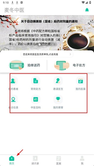 3、注冊(cè)成功后,進(jìn)入麥冬中醫(yī)app首頁(yè),可開(kāi)始使用我的患者、常用處方、邀請(qǐng)醫(yī)生等相關(guān)功能。
