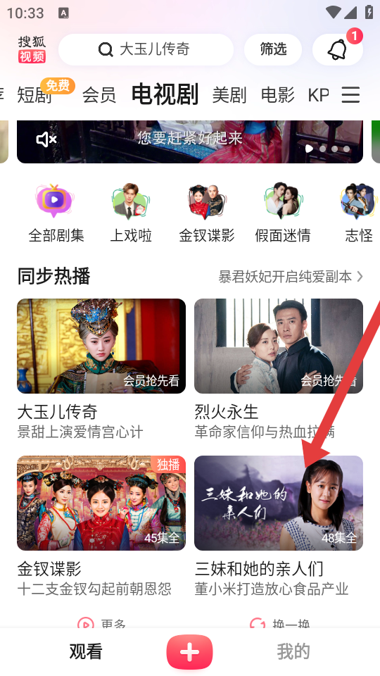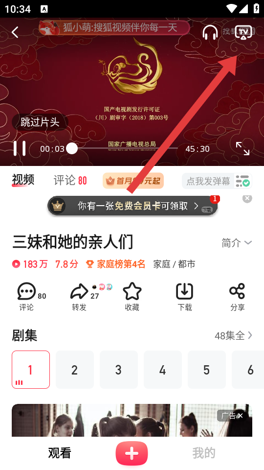 1、打開(kāi)搜狐視頻APP,在觀看頁(yè)面找到想要投屏的電視劇,點(diǎn)擊進(jìn)入該劇的播放頁(yè)面。