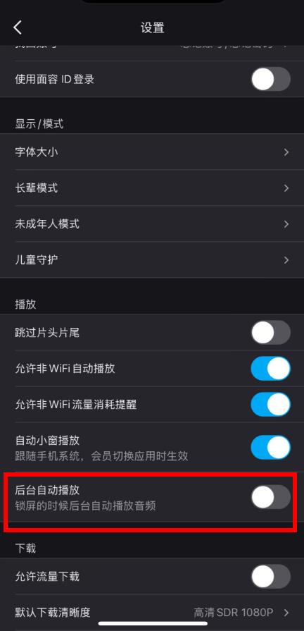 3、在設(shè)置頁面中,找到播放板塊里的后臺(tái)自動(dòng)播放選項(xiàng),點(diǎn)擊關(guān)閉其右側(cè)的開關(guān)即可。