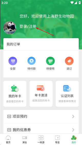 1、進入上海野生動物園首頁,點擊底部導(dǎo)航欄的我的選項,進入個人頁面。