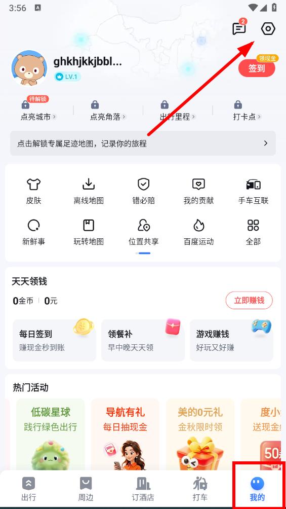 1、打開百度地圖應(yīng)用,點(diǎn)擊底部導(dǎo)航欄中的我的,在界面右上角點(diǎn)擊設(shè)置圖標(biāo),進(jìn)入設(shè)置頁面。
