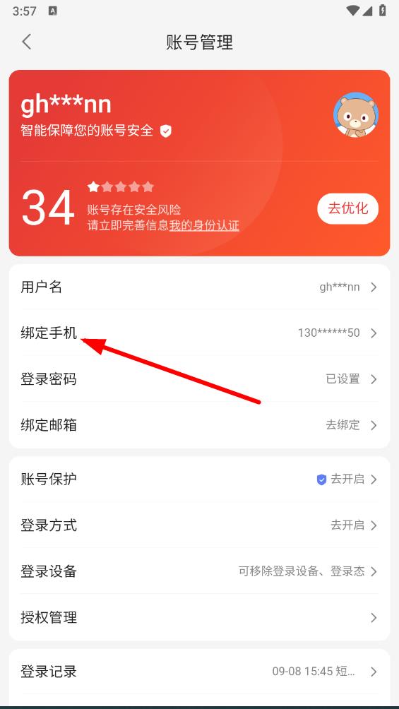 3、在賬號(hào)管理界面里點(diǎn)擊綁定手機(jī)選項(xiàng),進(jìn)入修改手機(jī)號(hào)頁面。