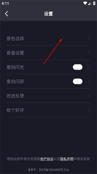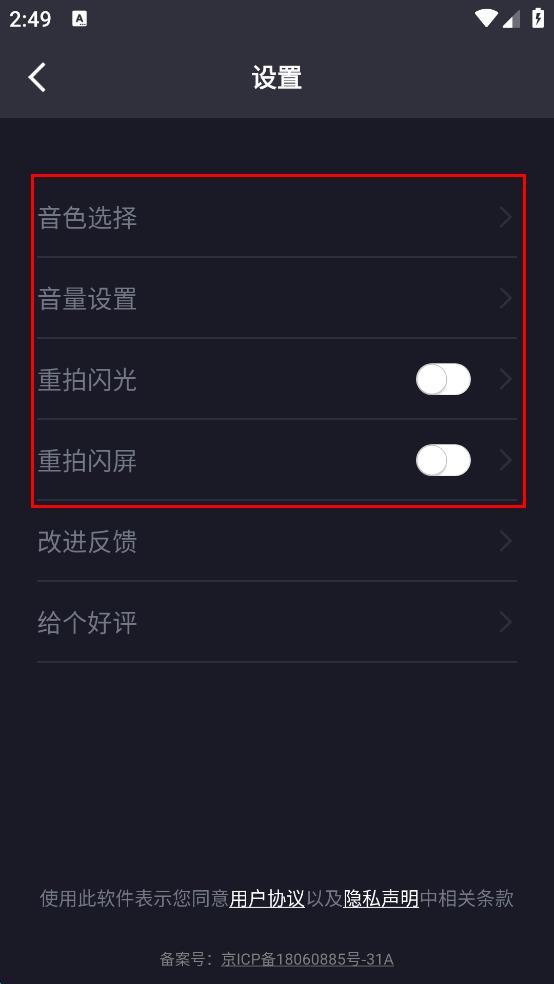 2、在設(shè)置頁面可進行音色選擇、音量設(shè)置,還可開啟重拍閃光和重拍閃屏功能。