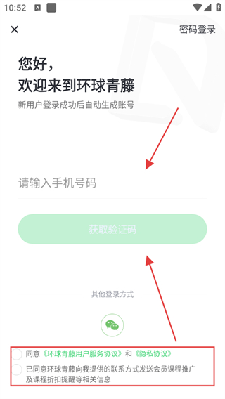4、輸入手機號碼,勾選兩個協(xié)議,點擊獲取驗證碼,輸入驗證碼。