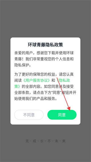 1、打開環(huán)球青藤APP,在彈出的環(huán)球青藤隱私政策界面,點擊同意。